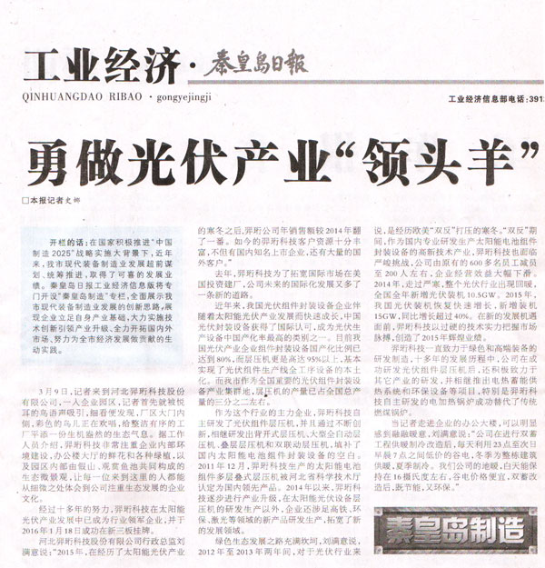 開欄的話:在國家積極推進“中國制造2025”戰(zhàn)略實施大背景下,近年來,我市現(xiàn)代化裝備制造業(yè)發(fā)展超前謀劃、統(tǒng)籌推進,取得了可喜的發(fā)展業(yè)績。秦皇島日報工業(yè)經(jīng)濟信息版將專門開設(shè)“秦皇島制造”專欄,全面展示我市現(xiàn)代裝備制造業(yè)發(fā)展的創(chuàng)新思路,展現(xiàn)企業(yè)立足自身產(chǎn)業(yè)基礎(chǔ),大力實施技術(shù)創(chuàng)新引領(lǐng)產(chǎn)業(yè)升級、全力開拓國內(nèi)外市場、努力為全市經(jīng)濟發(fā)展做貢獻的生動實踐。