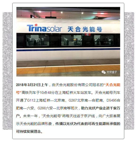 2018年3月21日上午,由天合光能股份有限公司冠名的“天合光能號”高鐵列車于10點(diǎn)48分在上海虹橋火車站發(fā)車。天合光能號列車開通了G112上海虹橋—北京南、G267北京南—合肥南、D5495合肥南—六安、G266六安—北京南等班次,助力光伏產(chǎn)業(yè)走進(jìn)千家萬戶。未來一年,“天合光能號”將每天往返于京滬線,向廣大旅客展示天合光能的品牌形象,傳播以光伏為代表的可再生能源所承載的可持續(xù)發(fā)展理念。