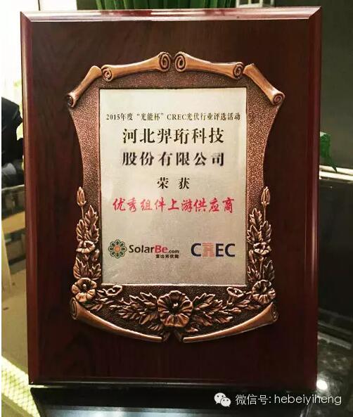 2015年11月5日,由solarbe索比光伏網(wǎng)和《光能雜志》共同主辦的 2015年“光能杯”CREC年度頒獎(jiǎng)典禮在無(wú)錫盛大舉行,河北羿珩科技股份有限公司(以下簡(jiǎn)稱(chēng)“羿珩科技”)榮獲“優(yōu)秀組件上游供應(yīng)商”稱(chēng)號(hào)。本年度"光能"杯光伏行業(yè)獎(jiǎng)評(píng)活動(dòng)吸引了中國(guó)光伏領(lǐng)域上百家重量級(jí)企業(yè)的積極參與,以樹(shù)立行業(yè)標(biāo)桿并推動(dòng)整個(gè)行業(yè)健康理性發(fā)展為目標(biāo)。