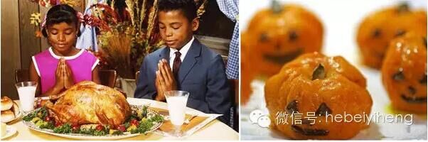 在餐桌上,火雞和南瓜餅都是必備的。每逢感恩節(jié),美國人家家戶戶都要吃火雞。火雞已成為感恩節(jié)的象征,他們通常還吃一些傳統(tǒng)菜肴,例如西葫蘆、奶油洋蔥、土豆泥、番瓜派等等。餐后,經(jīng)常還做些傳統(tǒng)游戲,比如:跳舞、各種比賽等許多娛樂活動。人們最喜愛的游戲要算南瓜賽跑了。比賽者用一把小勺推著南瓜跑,規(guī)則是絕對不能用手碰南瓜,先到終點者獲獎,比賽用的勺子越小,游戲就越有意思。
