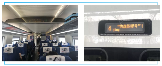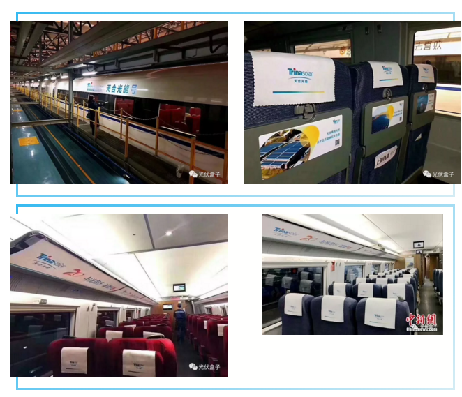 “天合光能號”的車身、內(nèi)外車門、行李架、頭巾和小桌板等位置均印有天合光能企業(yè)標(biāo)識和“與光同行,‘誠’就夢想”的口號。