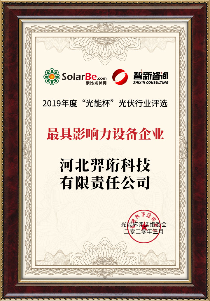 河北羿珩科技實力斬獲2019年“光能杯”光伏行業(yè)評選“最具影響力設(shè)備企業(yè)”大獎