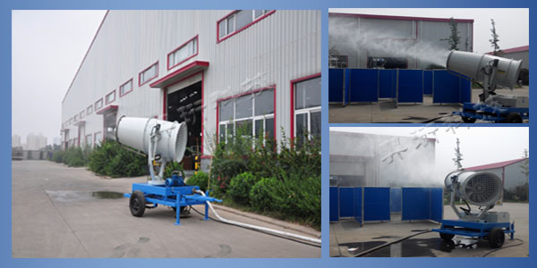 Aerodynamics was used with water through the pump pressure, combined with a given pressure blower. Then it conveys micron atomized particles through the nozzle to form the columnar mist shape. And it transfers to the far distance, to cover and control the distant place of dust sources pollution.